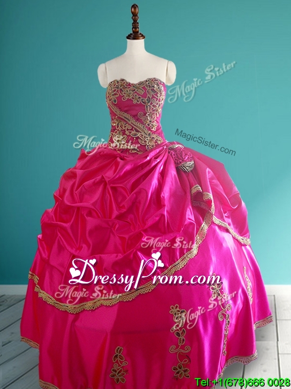 Neckline : SweetheartShown Color : Hot PinkSilhouette : Ball GownsSleeve Length : sleevelessHemline : floor lengthBack Detail : Lace upFabric : TaffetaEmbellishment : Beading,Appliques,Pick UpsOccasion : Military Ball,Sweet 16,QuinceaneraSeason : Spring,Summer,Fall,Winter