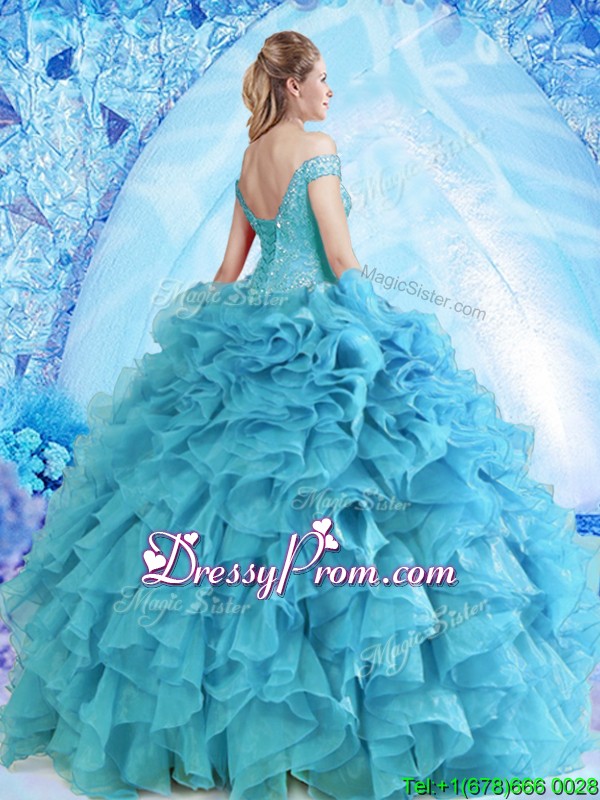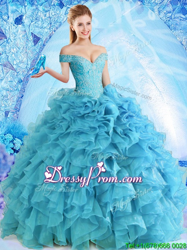 Neckline : Off the shoulderShown Color : Baby BlueSilhouette : Ball GownsSleeve Length : sleevelessHemline : floor lengthBack Detail : Lace upFabric : OrganzaEmbellishment : Beading,RufflesOccasion : Military Ball,Sweet 16,QuinceaneraSeason : Spring,Summer,Fall,Winter