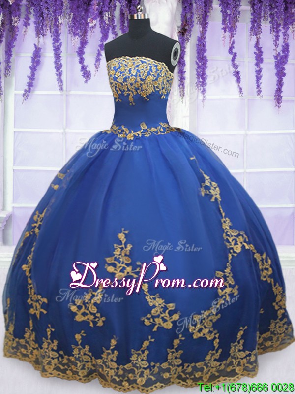 Neckline : StraplessShown Color : BlueSilhouette : Ball GownsSleeve Length : sleevelessHemline : floor lengthBack Detail : ZipperFabric : OrganzaEmbellishment : AppliquesOccasion : Military Ball,Sweet 16,QuinceaneraSeason : Spring,Summer,Fall,Winter