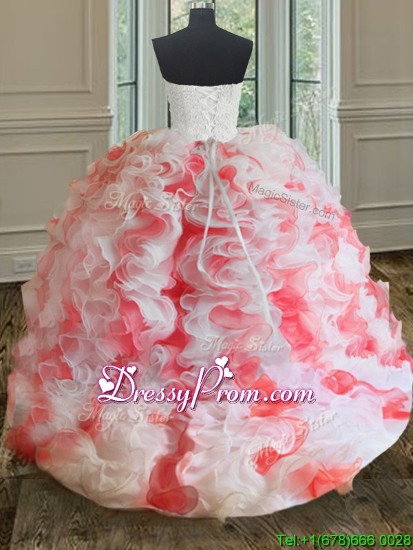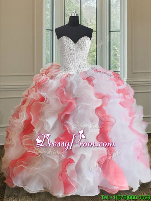 Neckline : Sweetheart Shown Color : White And Red Silhouette : Ball Gowns Sleeve Length : sleeveless Hemline : with train Back Detail : Lace up Fabric : Organza Embellishment : Beading,Ruffles Occasion : Military Ball,Sweet 16,Quinceanera Season : Spring,Summer,Fall,Winter