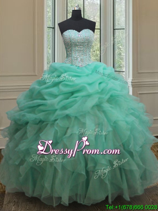 Neckline : SweetheartShown Color : TurquoiseSilhouette : Ball GownsSleeve Length : sleevelessHemline : floor lengthBack Detail : Lace upFabric : OrganzaEmbellishment : Beading,Ruffles,Pick UpsOccasion : Military Ball,Sweet 16,QuinceaneraSeason : Spring,Summer,Fall,Winter