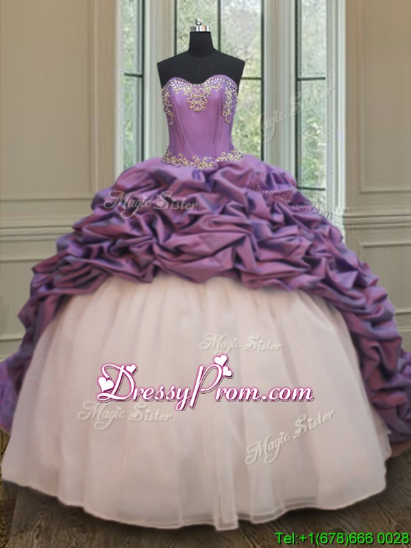 Neckline : SweetheartShown Color : White And PurpleSilhouette : Ball GownsSleeve Length : sleevelessHemline : with trainBack Detail : Lace upFabric : Organza,TaffetaEmbellishment : Beading,Pick UpsOccasion : Military Ball,Sweet 16,QuinceaneraSeason : Spring,Summer,Fall,Winter