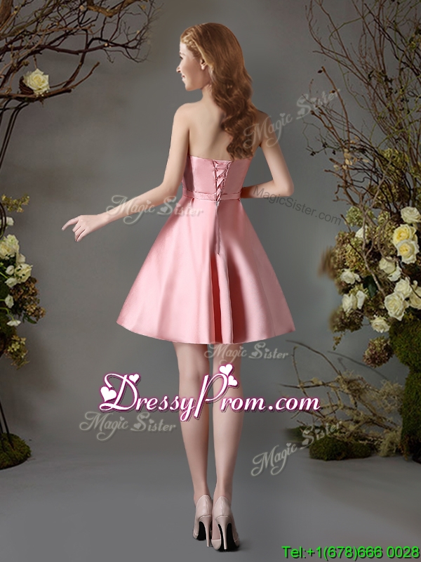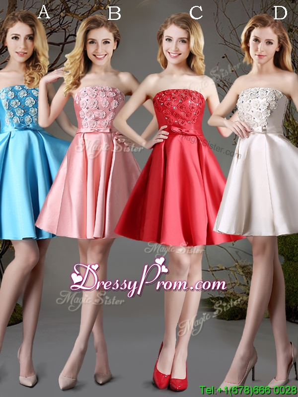 Neckline : StraplessShown Color : Pink Sleeve Length : sleevelessHemline : mini lengthBack Detail : Lace upFabric : SatinEmbellishment : Appliques,BowknotOccasion : Prom,Party,Cocktail,Homecoming,GraduationSeason : Spring,Summer,Fall