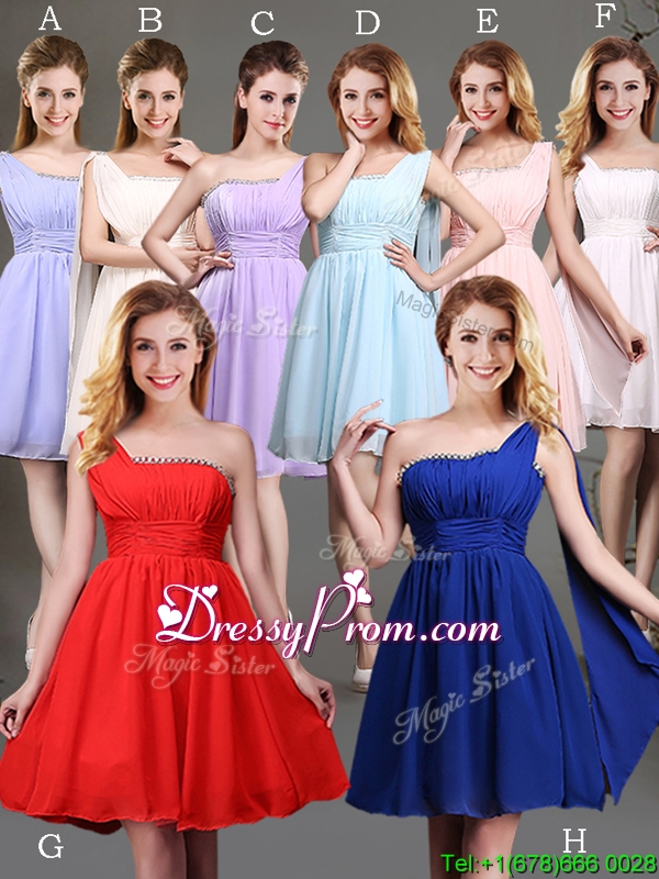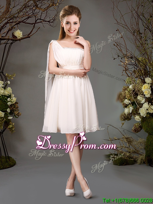 Neckline : One shoulderShown Color : ChampagneSilhouette : EmpireSleeve Length : sleevelessHemline : mini lengthBack Detail : ZipperFabric : ChiffonEmbellishment : Beading,RuchingOccasion : Prom,Party,Cocktail,Homecoming,GraduationSeason : Spring,Summer,Fall