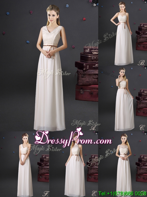 Neckline : V-neckShown Color : WhiteSilhouette : EmpireSleeve Length : sleevelessHemline : floor lengthBack Detail : ZipperFabric : ChiffonEmbellishment : Lace,BeltOccasion : Prom,Formal Evening,Party,Homecoming,GraduationSeason : Spring,Summer,Fall,Winter