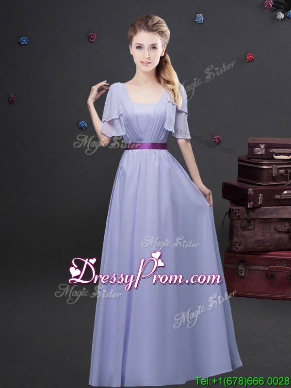 Neckline : SquareShown Color : LavenderSilhouette : EmpireSleeve Length : short sleevesHemline : floor lengthBack Detail : ZipperFabric : ChiffonEmbellishment : Ruching,BeltOccasion : Prom,Formal Evening,Party,Homecoming,GraduationSeason : Spring,Summer,Fall,Winter