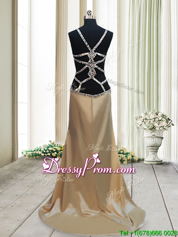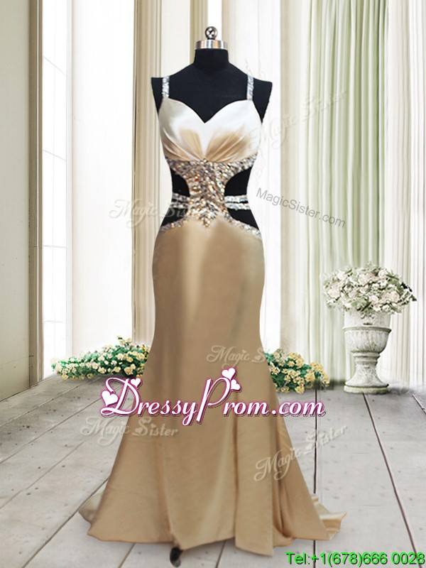 Neckline : StrapsShown Color : GoldSilhouette : MermaidSleeve Length : sleevelessHemline : with trainBack Detail : Criss crossFabric : Elastic Woven SatinEmbellishment : BeadingOccasion : Prom,Formal Evening,Party,Homecoming,Graduation,PageantSeason : Spring,Summer,Fall,Winter