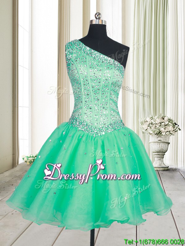 Neckline : One shoulderShown Color : TurquoiseSilhouette : A-lineSleeve Length : sleevelessHemline : mini lengthBack Detail : Lace upFabric : OrganzaEmbellishment : BeadingOccasion : Prom,Party,Cocktail,Homecoming,Graduation,PageantSeason : Spring,Summer,Fall