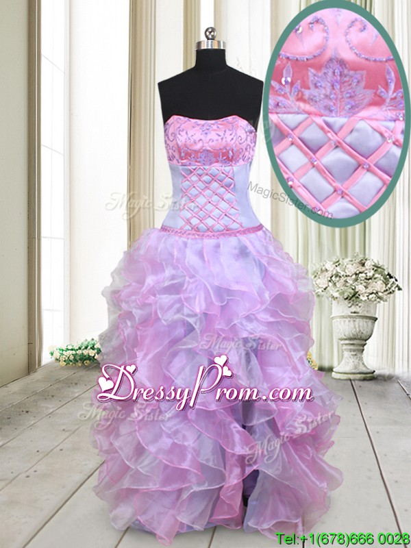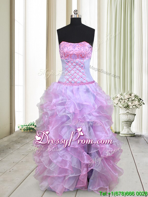 Neckline : StraplessShown Color : Multi-colorSilhouette : EmpireSleeve Length : sleevelessHemline : floor lengthBack Detail : Lace upFabric : OrganzaEmbellishment : Beading,RufflesOccasion : Prom,Formal Evening,Party,Homecoming,Graduation,PageantSeason : Spring,Summer,Fall,Winter