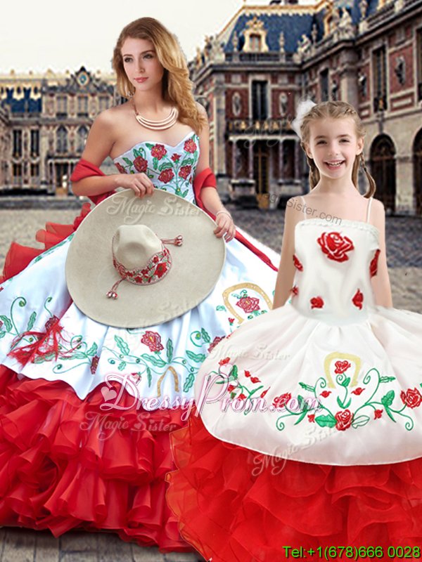 Neckline : SweetheartShown Color : White And Red Silhouette : Ball GownsSleeve Length : sleevelessHemline : floor lengthBack Detail : Lace upFabric : OrganzaEmbellishment : EmbroideryOccasion : Sweet 16,QuinceaneraSeason : Spring,Summer,Fall,Winter