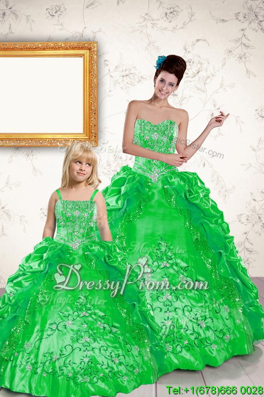 Neckline : SweetheartShown Color : GreenSilhouette : Ball GownsSleeve Length : sleevelessHemline : floor lengthBack Detail : Lace upFabric : TaffetaEmbellishment : Beading,Embroidery,Pick UpsOccasion : Military Ball,Sweet 16,QuinceaneraSeason : Spring,Summer,Fall,Winter