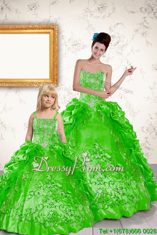 Neckline : SweetheartShown Color : Spring GreenSilhouette : Ball GownsSleeve Length : sleevelessHemline : floor lengthBack Detail : Lace upFabric : TaffetaEmbellishment : Beading,Embroidery,Pick UpsOccasion : Military Ball,Sweet 16,QuinceaneraSeason : Spring,Summer,Fall,Winter