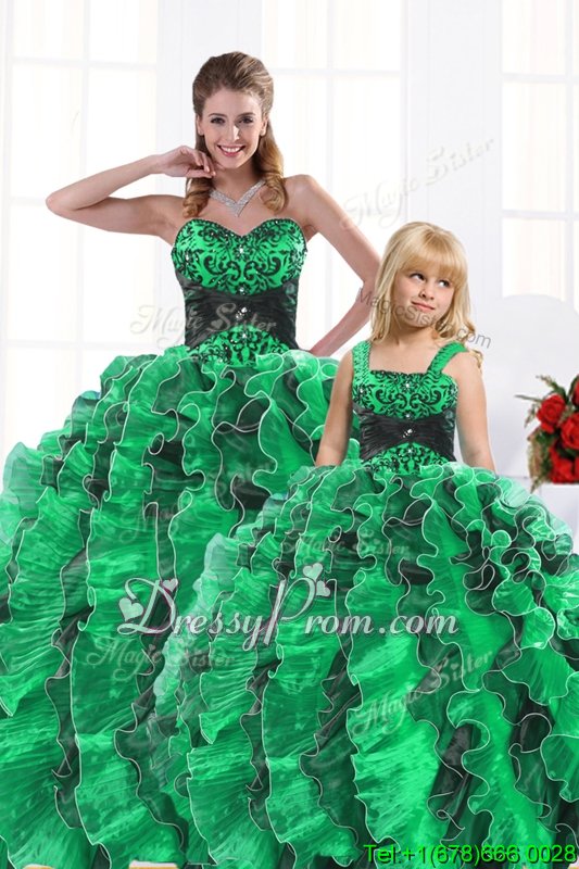 Neckline : SweetheartShown Color : GreenSilhouette : Ball GownsSleeve Length : sleevelessHemline : floor lengthBack Detail : Lace upFabric : OrganzaEmbellishment : Beading,Appliques,RufflesOccasion : Military Ball,Sweet 16,QuinceaneraSeason : Spring,Summer,Fall,Winter