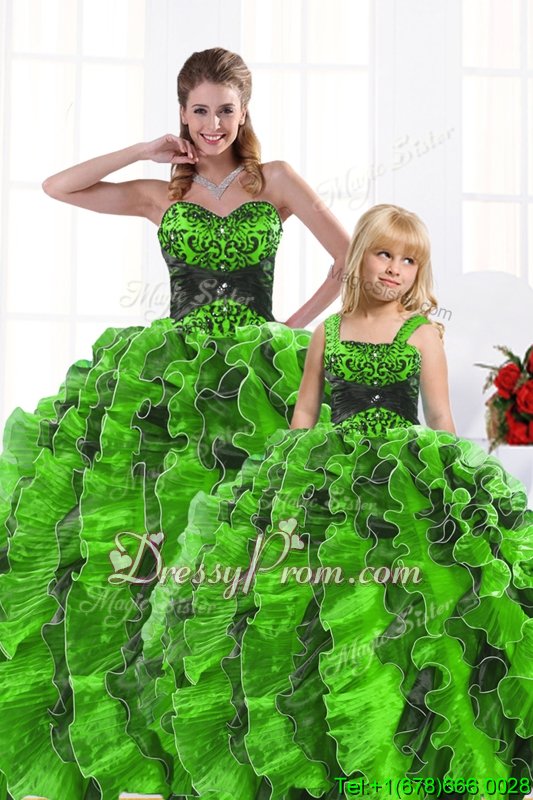 Neckline : SweetheartShown Color : Spring GreenSilhouette : Ball GownsSleeve Length : sleevelessHemline : floor lengthBack Detail : Lace upFabric : OrganzaEmbellishment : Beading,Appliques,RufflesOccasion : Military Ball,Sweet 16,QuinceaneraSeason : Spring,Summer,Fall,Winter
