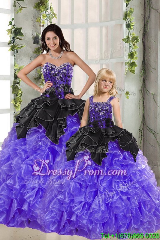 Neckline : SweetheartShown Color : Black And Purple Silhouette : Ball GownsSleeve Length : sleevelessHemline : floor lengthBack Detail : Lace upFabric : OrganzaEmbellishment : Beading,RufflesOccasion : Military Ball,Sweet 16,QuinceaneraSeason : Spring,Summer,Fall,Winter