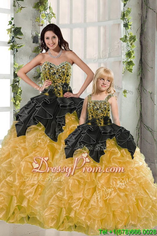 Neckline : SweetheartShown Color : Black,YellowSilhouette : Ball GownsSleeve Length : sleevelessHemline : floor lengthBack Detail : Lace upFabric : OrganzaEmbellishment : Beading,RufflesOccasion : Military Ball,Sweet 16,QuinceaneraSeason : Spring,Summer,Fall,Winter