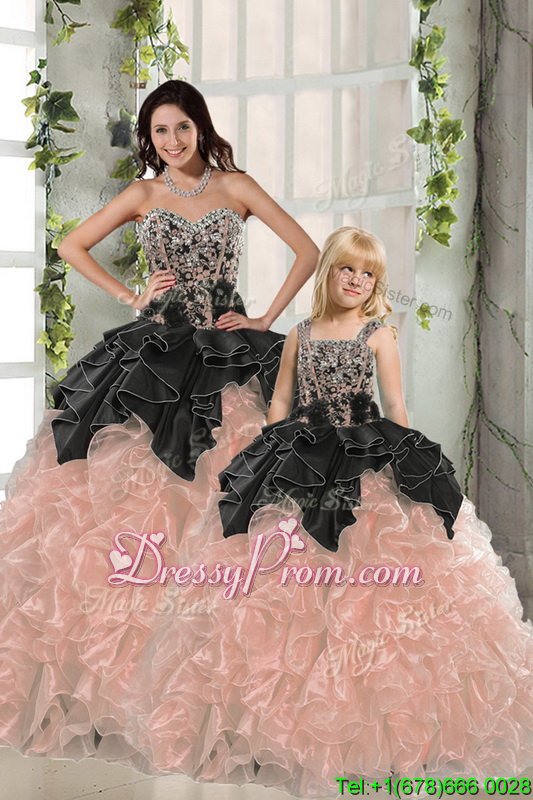 Neckline : SweetheartShown Color : Black,PeachSilhouette : Ball GownsSleeve Length : sleevelessHemline : floor lengthBack Detail : Lace upFabric : OrganzaEmbellishment : Beading,RufflesOccasion : Military Ball,Sweet 16,QuinceaneraSeason : Spring,Summer,Fall,Winter