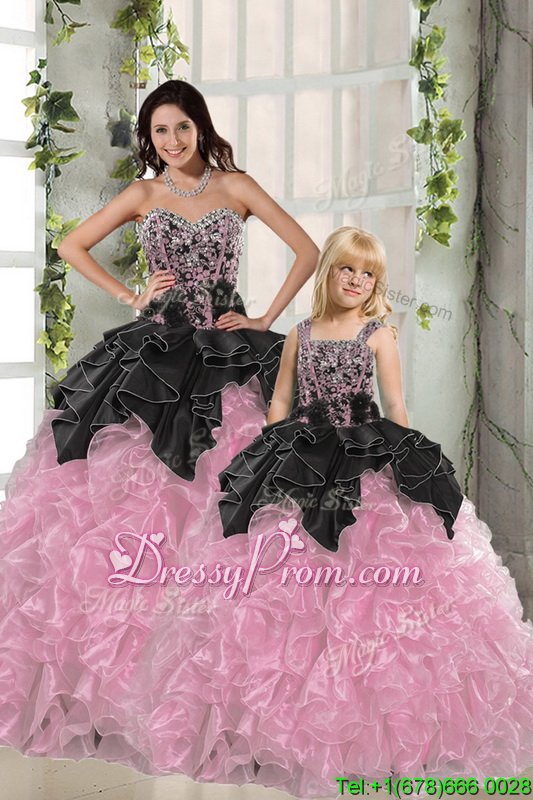 Neckline : SweetheartShown Color : Pink And BlackSilhouette : Ball GownsSleeve Length : sleevelessHemline : floor lengthBack Detail : Lace upFabric : OrganzaEmbellishment : Beading,RufflesOccasion : Military Ball,Sweet 16,QuinceaneraSeason : Spring,Summer,Fall,Winter