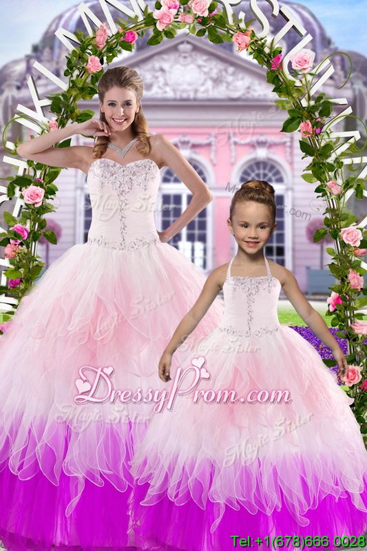 Sleeveless Floor Length Beading Lace Up Quinceanera Dress with Multi-color