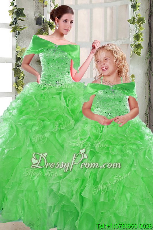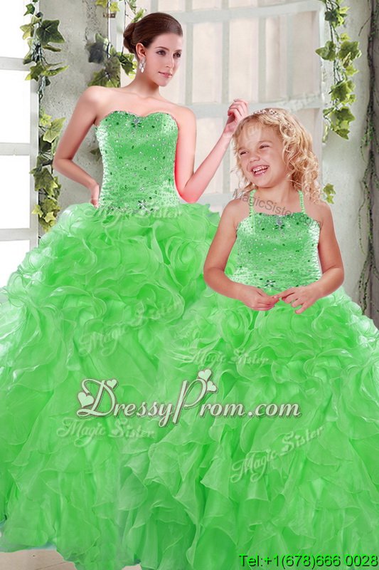 Green Organza Lace Up Sweetheart Sleeveless Floor Length 15th Birthday Dress Beading and Ruffles