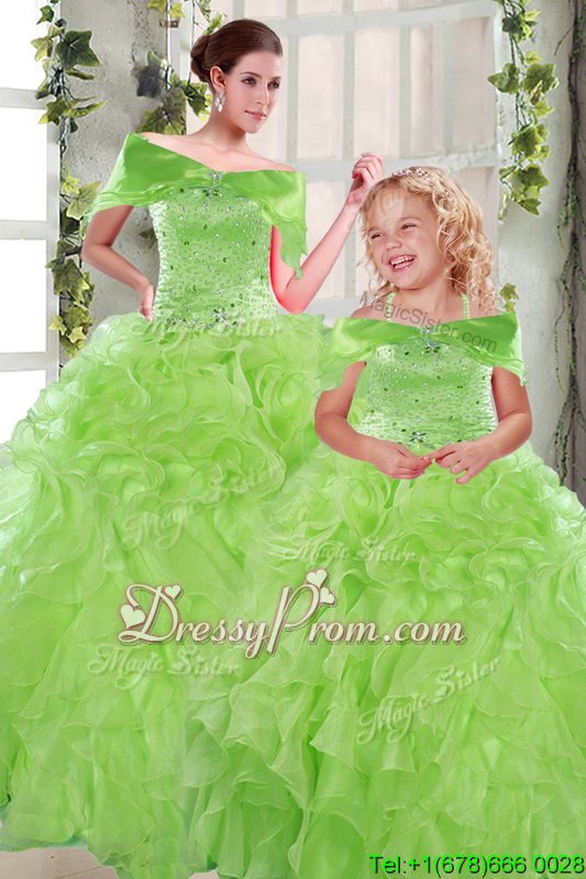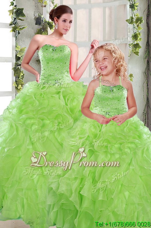 Neckline : StraplessShown Color : Spring GreenSilhouette : Ball GownsSleeve Length : sleevelessHemline : floor lengthBack Detail : Lace upFabric : OrganzaEmbellishment : Beading,RufflesOccasion : Military Ball,Sweet 16,QuinceaneraSeason : Spring,Summer,Fall,Winter