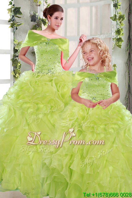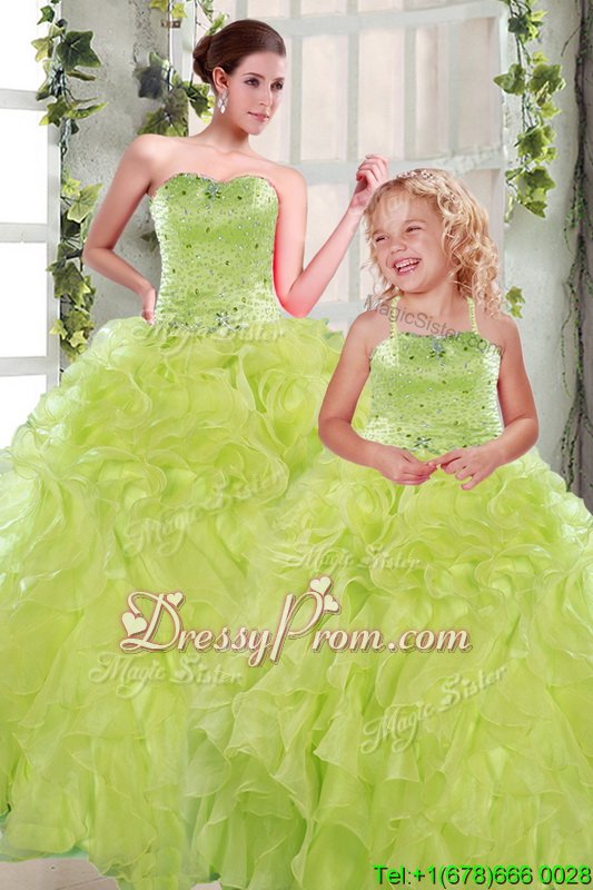 Neckline : StraplessShown Color : Yellow GreenSilhouette : Ball GownsSleeve Length : sleevelessHemline : floor lengthBack Detail : Lace upFabric : OrganzaEmbellishment : Beading,RufflesOccasion : Military Ball,Sweet 16,QuinceaneraSeason : Spring,Summer,Fall,Winter