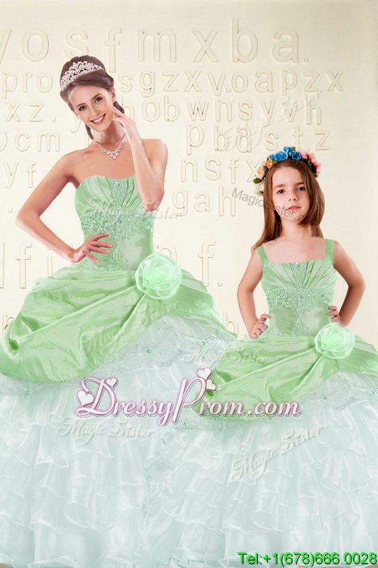 Fine Sleeveless Organza and Taffeta Floor Length Lace Up Sweet 16 Dress inSpring Green forSpring and Summer and Fall and Winter withBeading and Ruffled Layers and Hand Made Flower