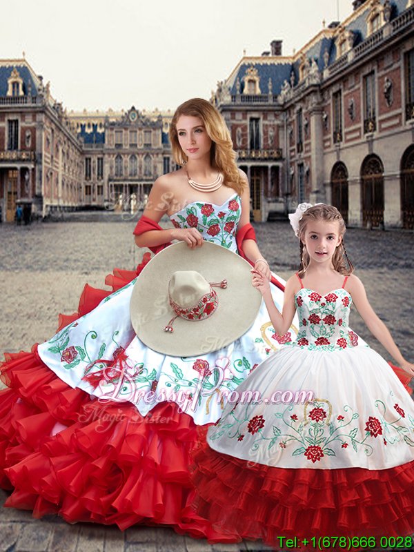 Neckline : Sweetheart Shown Color : White And Red Silhouette : Ball Gowns Sleeve Length : sleeveless Hemline : floor length Back Detail : Lace up Fabric : Organza,Taffeta Embellishment : Embroidery Occasion : Military Ball,Sweet 16,Quinceanera Season : Spring,Summer,Fall,Winter