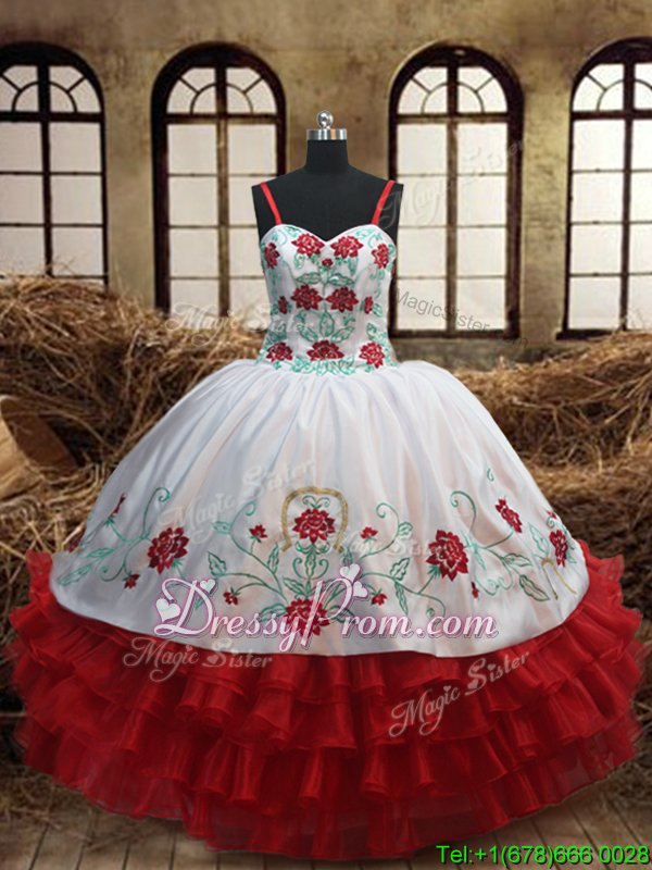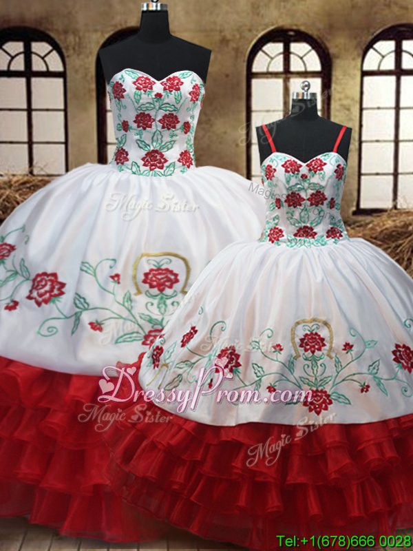 Neckline : SweetheartShown Color : White,RedSilhouette : Ball GownsSleeve Length : sleevelessHemline : floor lengthBack Detail : Lace upFabric : OrganzaEmbellishment : Embroidery,Ruffled LayersOccasion : Military Ball,Sweet 16,QuinceaneraSeason : Spring,Summer,Fall,Winter