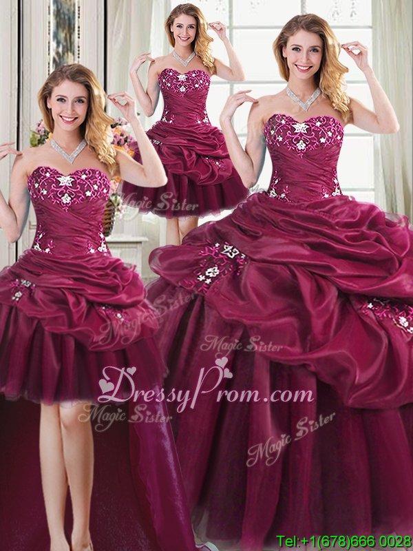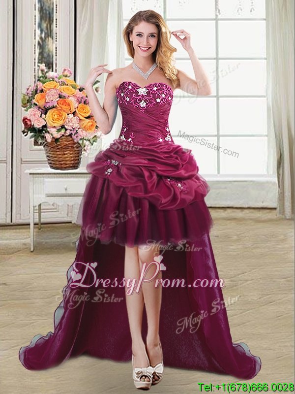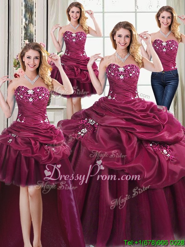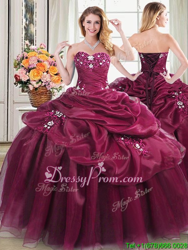 Neckline : SweetheartShown Color : BurgundySilhouette : Ball GownsSleeve Length : sleevelessHemline : floor lengthBack Detail : Lace upFabric : OrganzaEmbellishment : Beading,Appliques,Pick UpsOccasion : Military Ball,Sweet 16,QuinceaneraSeason : Spring,Summer,Fall,Winter