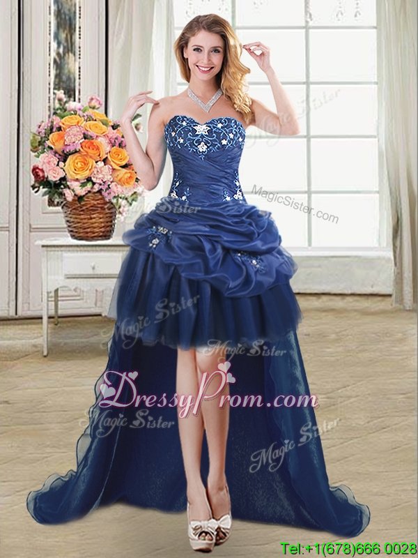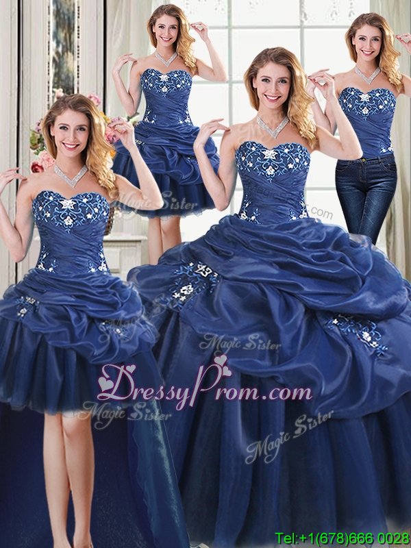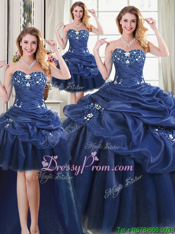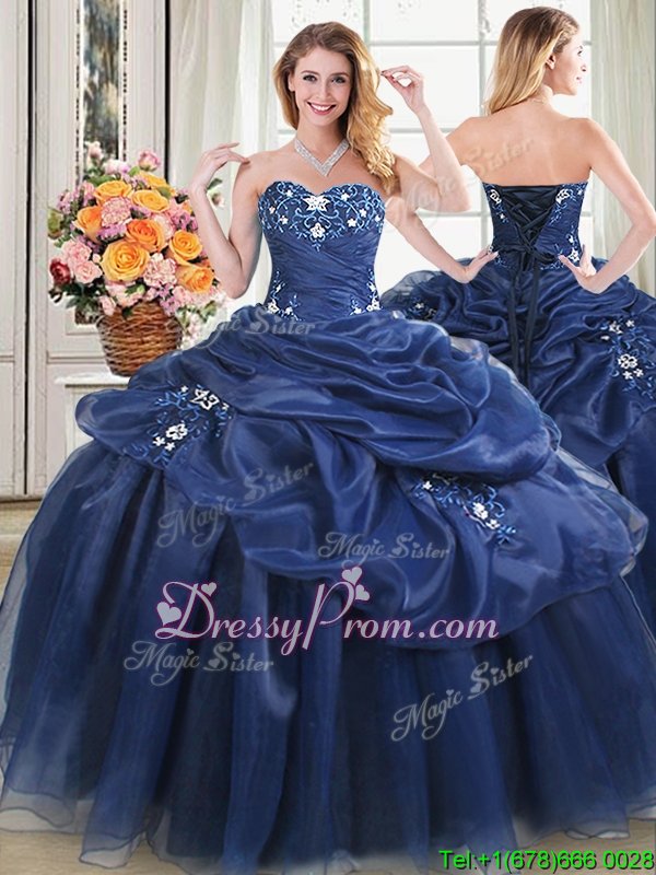 Neckline : SweetheartShown Color : Navy BlueSilhouette : Ball GownsSleeve Length : sleevelessHemline : floor lengthBack Detail : Lace upFabric : OrganzaEmbellishment : AppliquesOccasion : Military Ball,Sweet 16,QuinceaneraSeason : Spring,Summer,Fall