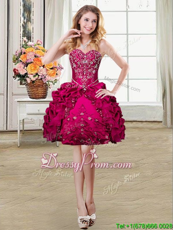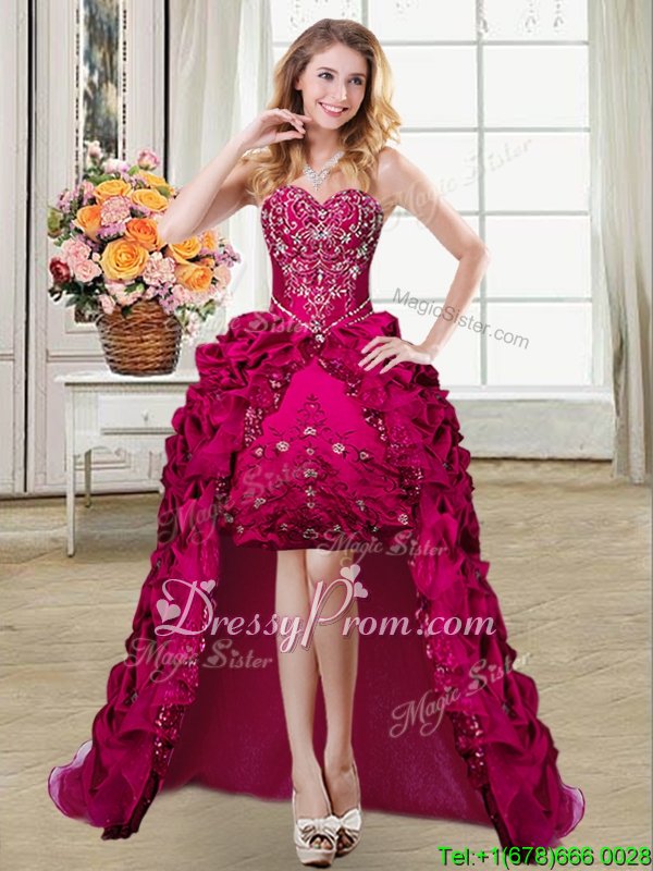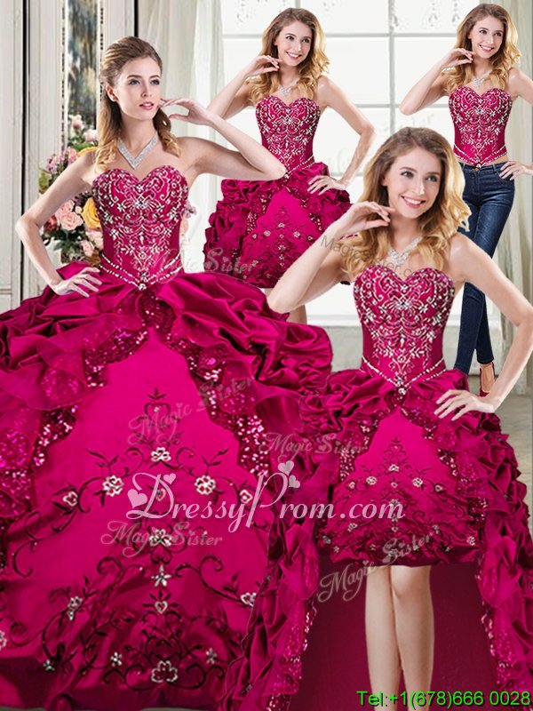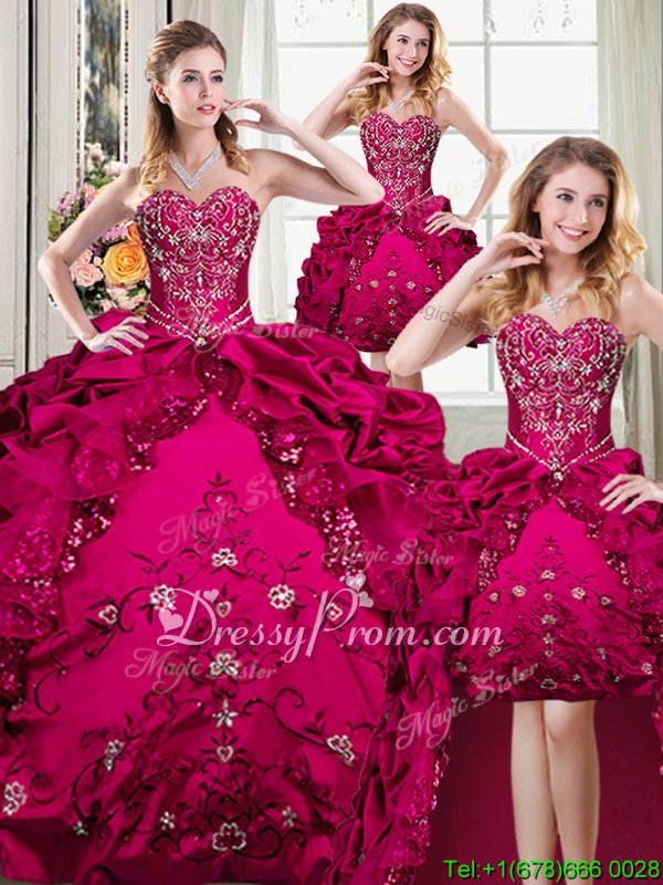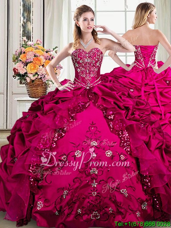 Neckline : SweetheartShown Color : FuchsiaSilhouette : Ball GownsSleeve Length : sleevelessHemline : floor lengthBack Detail : Lace upFabric : Organza,TaffetaEmbellishment : Beading,EmbroideryOccasion : Military Ball,Sweet 16,QuinceaneraSeason : Spring,Summer,Fall,Winter