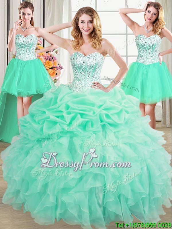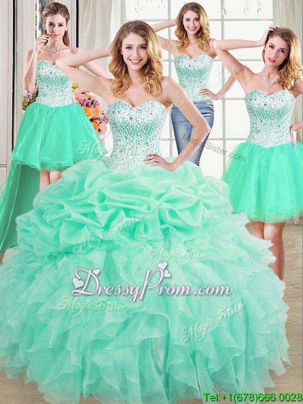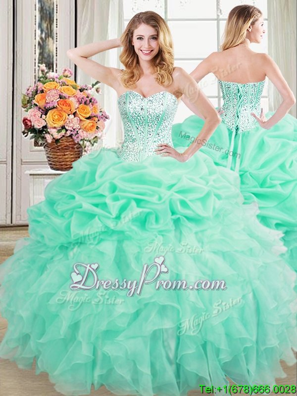 Neckline : SweetheartShown Color : Apple GreenSilhouette : Ball GownsSleeve Length : sleevelessHemline : floor lengthBack Detail : Lace upFabric : OrganzaEmbellishment : Beading,Ruffles,Pick UpsOccasion : Military Ball,Sweet 16,QuinceaneraSeason : Spring,Summer,Fall,Winter
