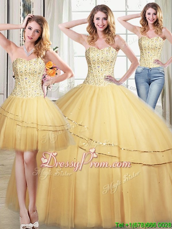 Neckline : SweetheartShown Color : GoldSilhouette : Ball GownsSleeve Length : sleevelessHemline : floor lengthBack Detail : Lace upFabric : TulleEmbellishment : Beading,SequinsOccasion : Military Ball,Sweet 16,QuinceaneraSeason : Spring,Summer,Fall,Winter
