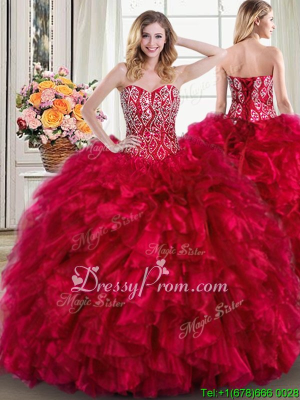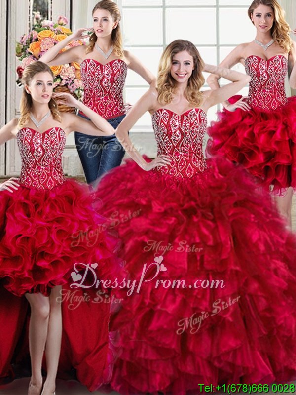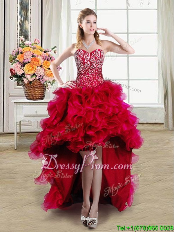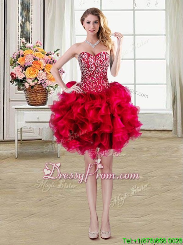 Custom Made Sleeveless Organza Brush Train Lace Up Sweet 16 Dresses inRed forSpring and Summer and Fall and Winter withBeading and Ruffles