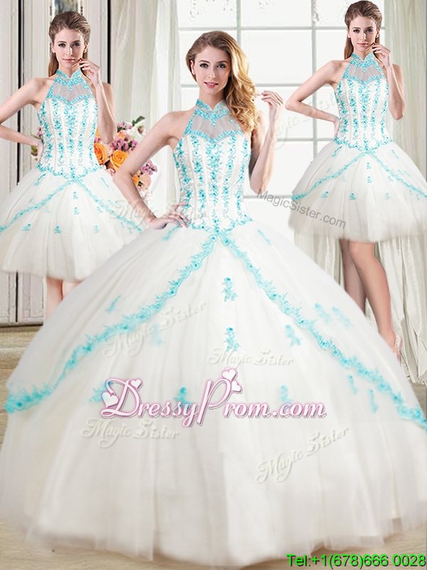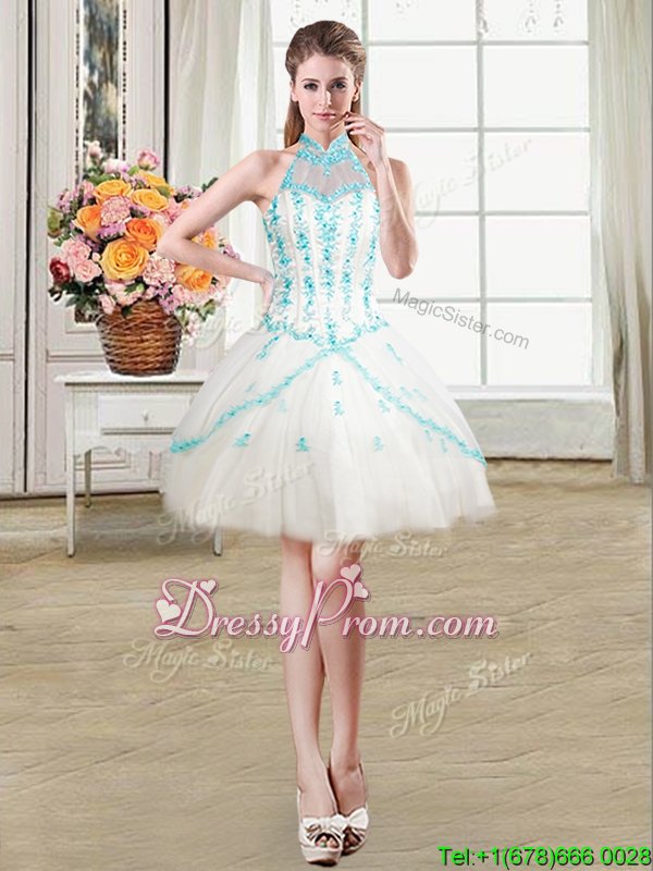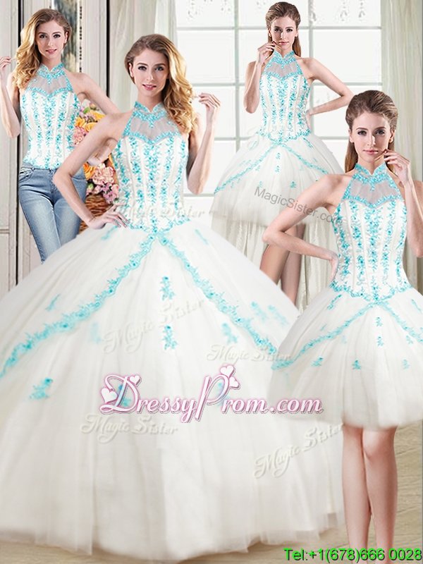 Neckline : Halter topShown Color : WhiteSilhouette : Ball GownsSleeve Length : sleevelessHemline : floor lengthBack Detail : Lace upFabric : TulleEmbellishment : Beading,AppliquesOccasion : Military Ball,Sweet 16,QuinceaneraSeason : Spring,Summer,Fall,Winter