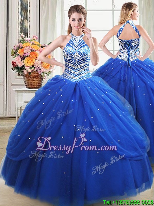 Neckline : Halter topShown Color : Royal BlueSilhouette : Ball GownsSleeve Length : sleevelessHemline : floor lengthBack Detail : Lace upFabric : TulleEmbellishment : Beading,Pick UpsOccasion : Military Ball,Sweet 16,QuinceaneraSeason : Spring,Summer,Fall,Winter