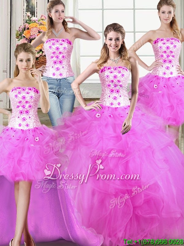 Neckline : StraplessShown Color : FuchsiaSilhouette : Ball GownsSleeve Length : sleevelessHemline : floor lengthBack Detail : Lace upFabric : TulleEmbellishment : Beading,Appliques,RufflesOccasion : Military Ball,Sweet 16,QuinceaneraSeason : Spring,Summer,Fall,Winter