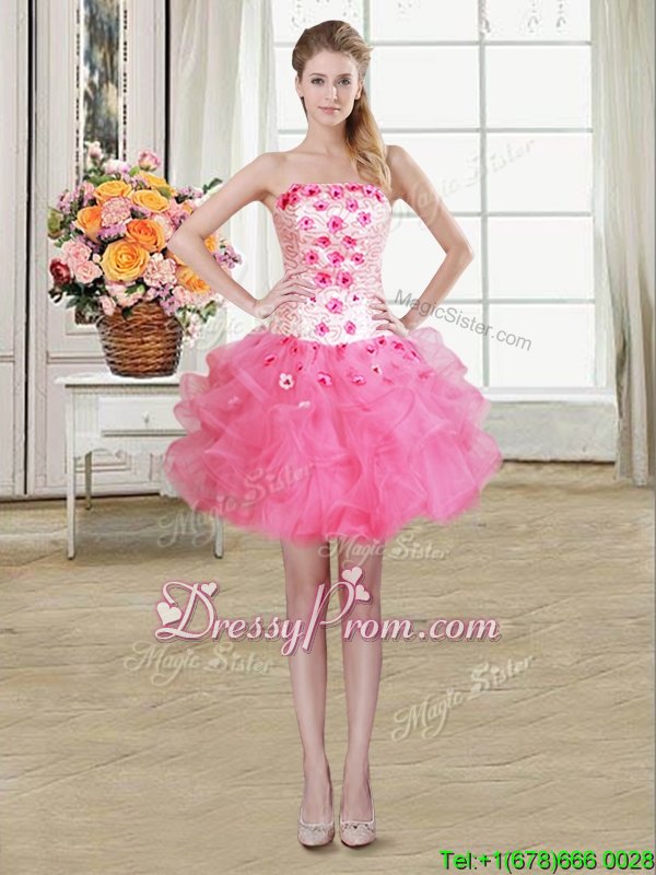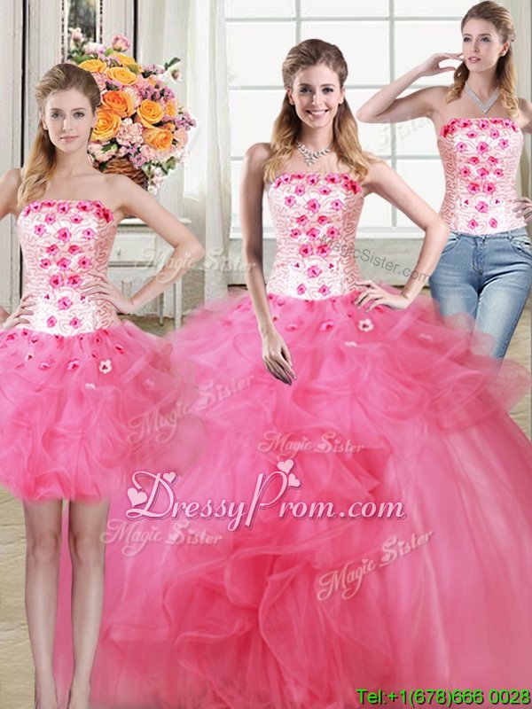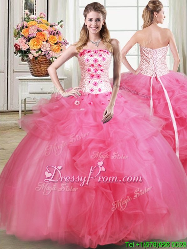 Neckline : StraplessShown Color : Hot PinkSilhouette : Ball GownsSleeve Length : sleevelessHemline : floor lengthBack Detail : Lace upFabric : TulleEmbellishment : Beading,Appliques,RufflesOccasion : Military Ball,Sweet 16,QuinceaneraSeason : Spring,Summer,Fall,Winter
