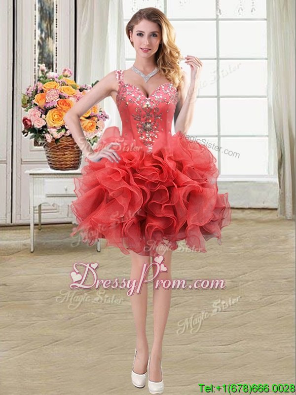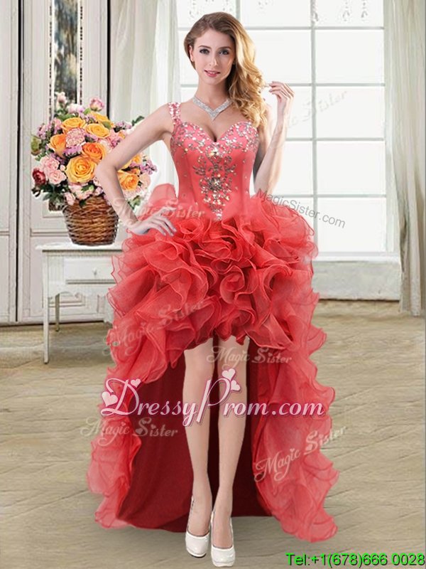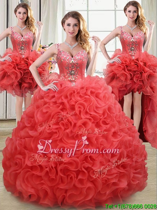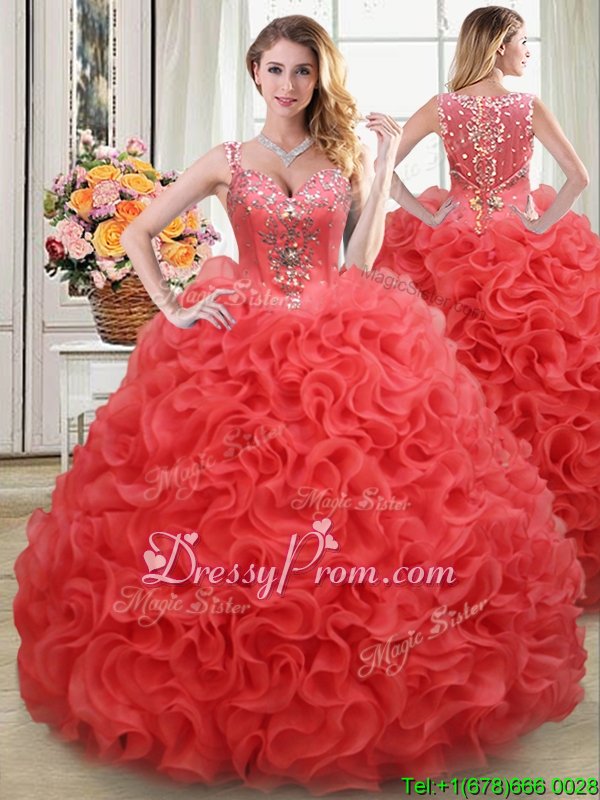 Neckline : StrapsShown Color : Coral RedSilhouette : Ball GownsSleeve Length : sleevelessHemline : floor lengthBack Detail : ZipperFabric : Fabric With Rolling FlowersEmbellishment : Beading,RufflesOccasion : Military Ball,Sweet 16,QuinceaneraSeason : Spring,Summer,Fall,Winter