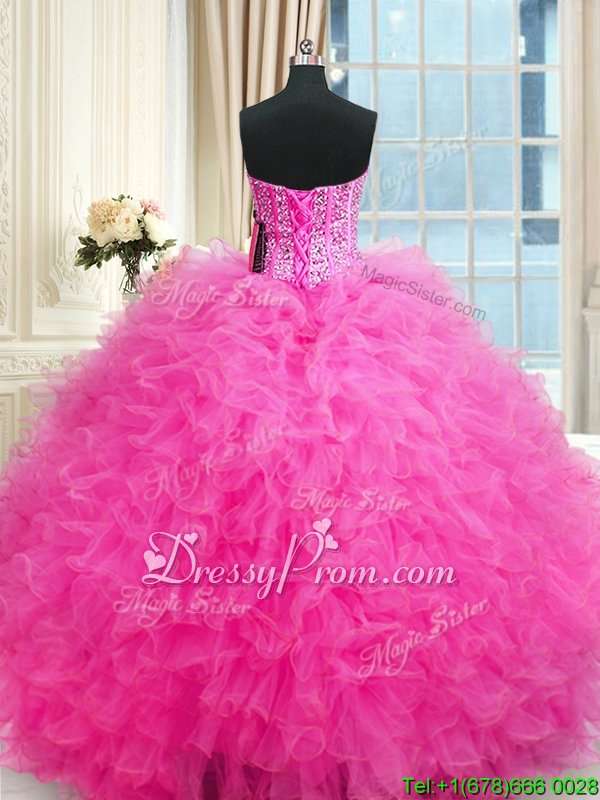 Neckline : StraplessShown Color : Rose Pink Silhouette : Ball GownsSleeve Length : sleevelessHemline : floor lengthBack Detail : Lace upFabric : TulleEmbellishment : Beading,RufflesOccasion : Military Ball,Sweet 16,QuinceaneraSeason : Spring,Summer,Fall,Winter