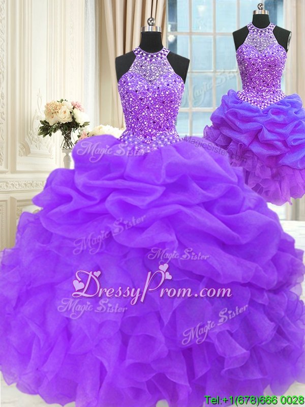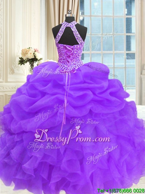 Neckline : High-neckShown Color : Eggplant PurpleSilhouette : Ball GownsSleeve Length : sleevelessHemline : floor lengthBack Detail : Lace upFabric : OrganzaEmbellishment : Beading,Pick UpsOccasion : Military Ball,Sweet 16,QuinceaneraSeason : Spring,Summer,Fall,Winter