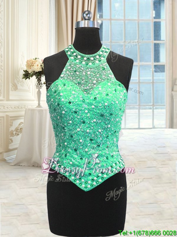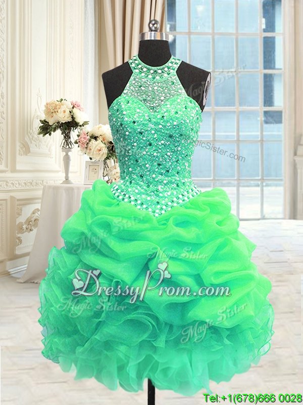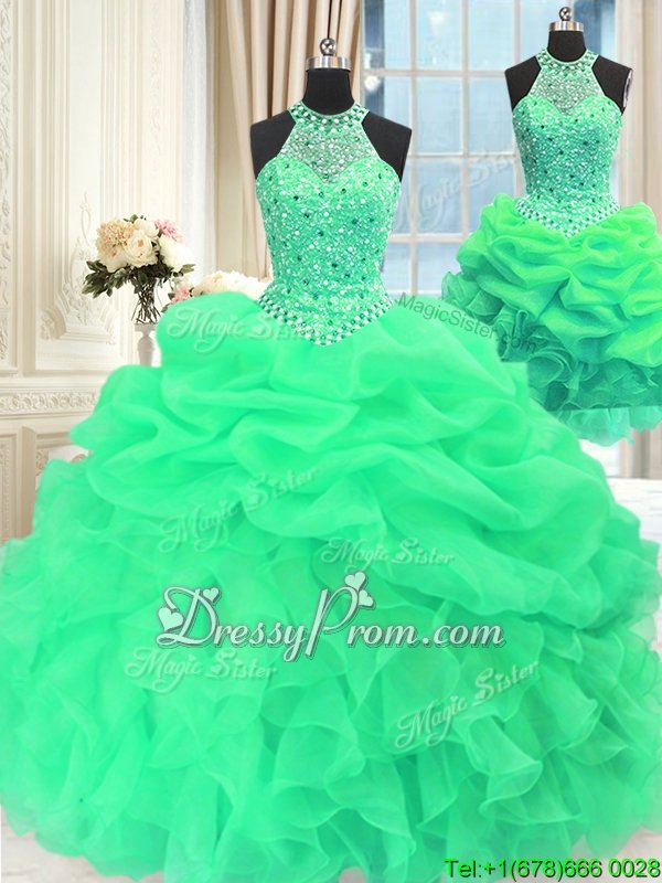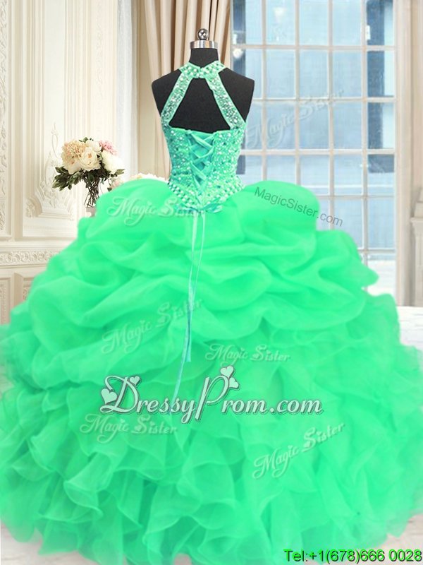 Neckline : High-neckShown Color : GreenSilhouette : Ball GownsSleeve Length : sleevelessHemline : floor lengthBack Detail : Lace upFabric : OrganzaEmbellishment : Beading,Pick UpsOccasion : Military Ball,Sweet 16,QuinceaneraSeason : Spring,Summer,Fall,Winter