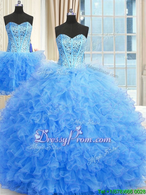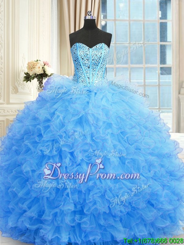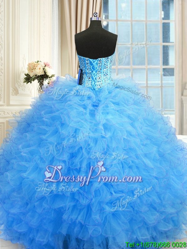 Neckline : StraplessShown Color : Baby BlueSilhouette : Ball GownsSleeve Length : sleevelessHemline : floor lengthBack Detail : Lace upFabric : TulleEmbellishment : Beading,RufflesOccasion : Military Ball,Sweet 16,QuinceaneraSeason : Spring,Summer,Fall,Winter