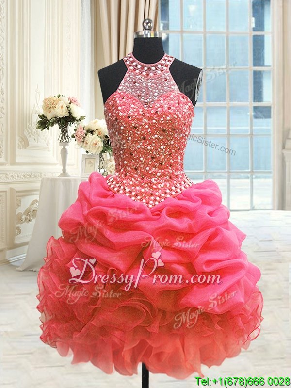 Neckline : High-neckShown Color : Watermelon RedSilhouette : Ball GownsSleeve Length : sleevelessHemline : floor lengthBack Detail : Lace upFabric : OrganzaEmbellishment : Beading,Pick UpsOccasion : Military Ball,Sweet 16,QuinceaneraSeason : Spring,Summer,Fall,Winter