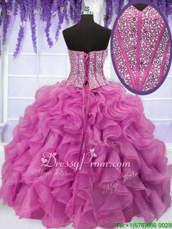 Neckline : SweetheartShown Color : LilacSilhouette : Ball GownsSleeve Length : sleevelessHemline : floor lengthBack Detail : Lace upFabric : OrganzaEmbellishment : Ruffles,SequinsOccasion : Military Ball,Sweet 16,QuinceaneraSeason : Spring,Summer,Fall,Winter
