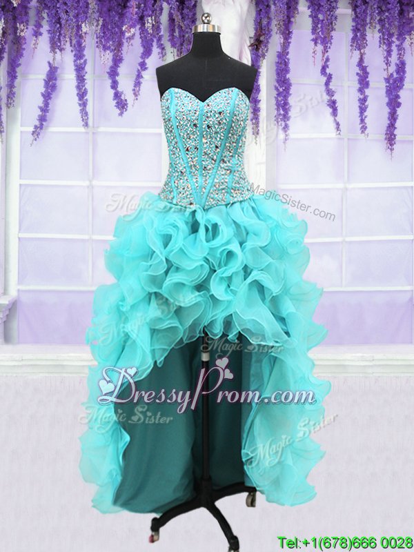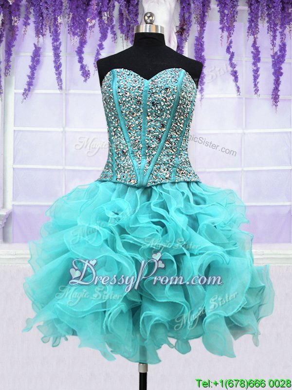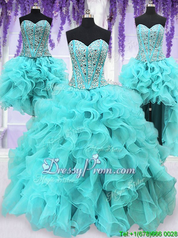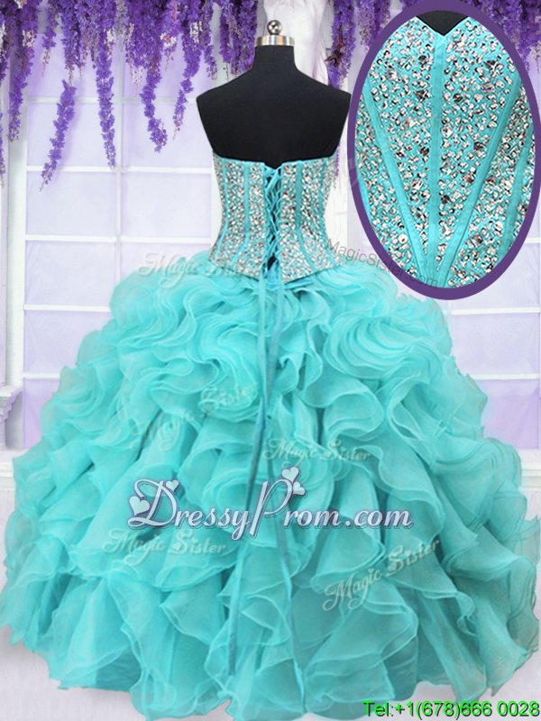 Neckline : SweetheartShown Color : Aqua BlueSilhouette : Ball GownsSleeve Length : sleevelessHemline : floor lengthBack Detail : Lace upFabric : OrganzaEmbellishment : Ruffles,SequinsOccasion : Military Ball,Sweet 16,QuinceaneraSeason : Spring,Summer,Fall,Winter