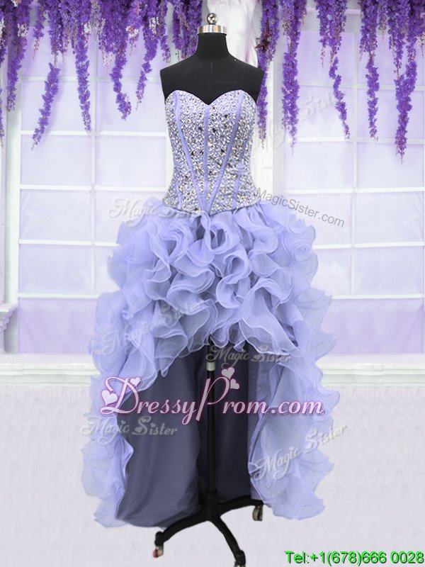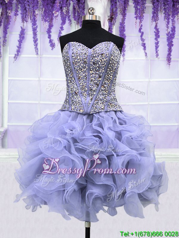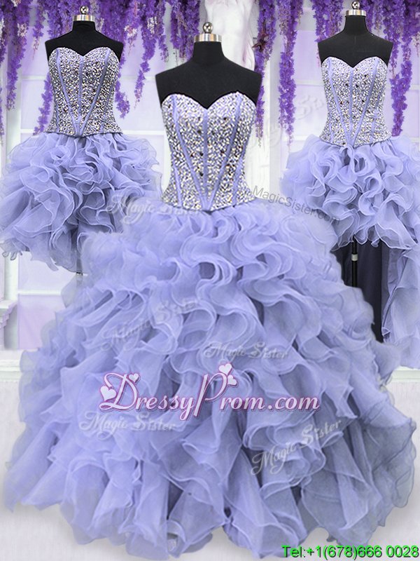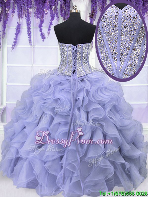 Neckline : SweetheartShown Color : LavenderSilhouette : Ball GownsSleeve Length : sleevelessHemline : floor lengthBack Detail : Lace upFabric : OrganzaEmbellishment : Ruffles,SequinsOccasion : Military Ball,Sweet 16,QuinceaneraSeason : Spring,Summer,Fall,Winter
