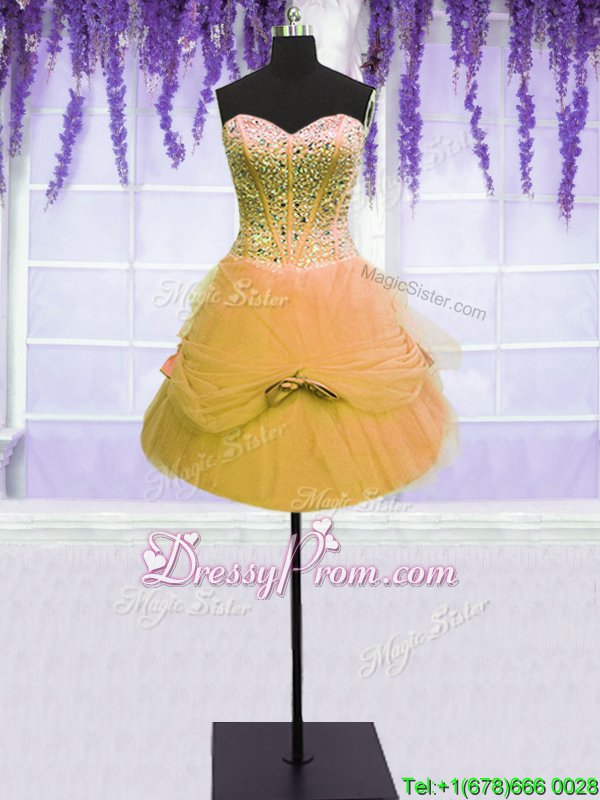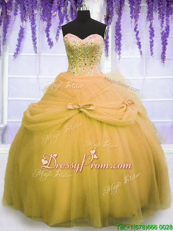 Neckline : SweetheartShown Color : GoldSilhouette : Ball GownsSleeve Length : sleevelessHemline : floor lengthBack Detail : Lace upFabric : TulleEmbellishment : Beading,BowknotOccasion : Military Ball,Sweet 16,QuinceaneraSeason : Spring,Summer,Fall,Winter
