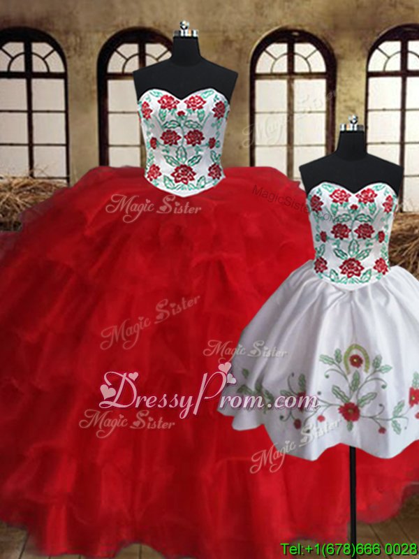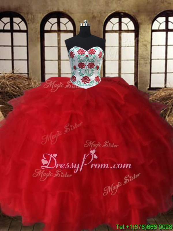 Neckline : SweetheartShown Color : White,RedSilhouette : Ball GownsSleeve Length : sleevelessHemline : floor lengthBack Detail : Lace upFabric : OrganzaEmbellishment : Embroidery,Ruffled LayersOccasion : Military Ball,Sweet 16,QuinceaneraSeason : Spring,Summer,Fall,Winter